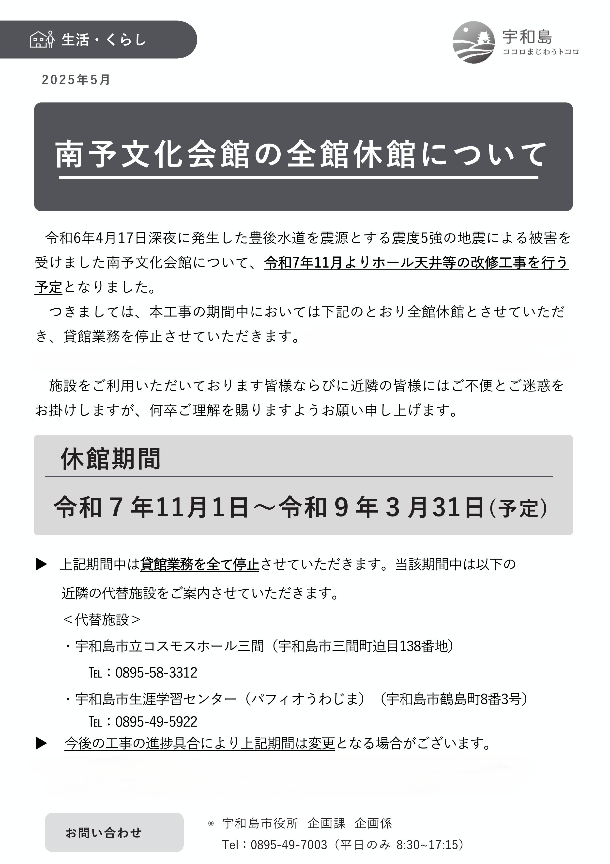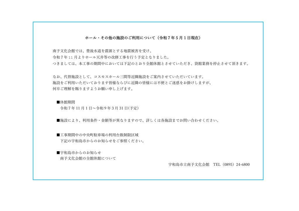 ■宇和島市からのお知らせ 南予文化会館の全館休館について
