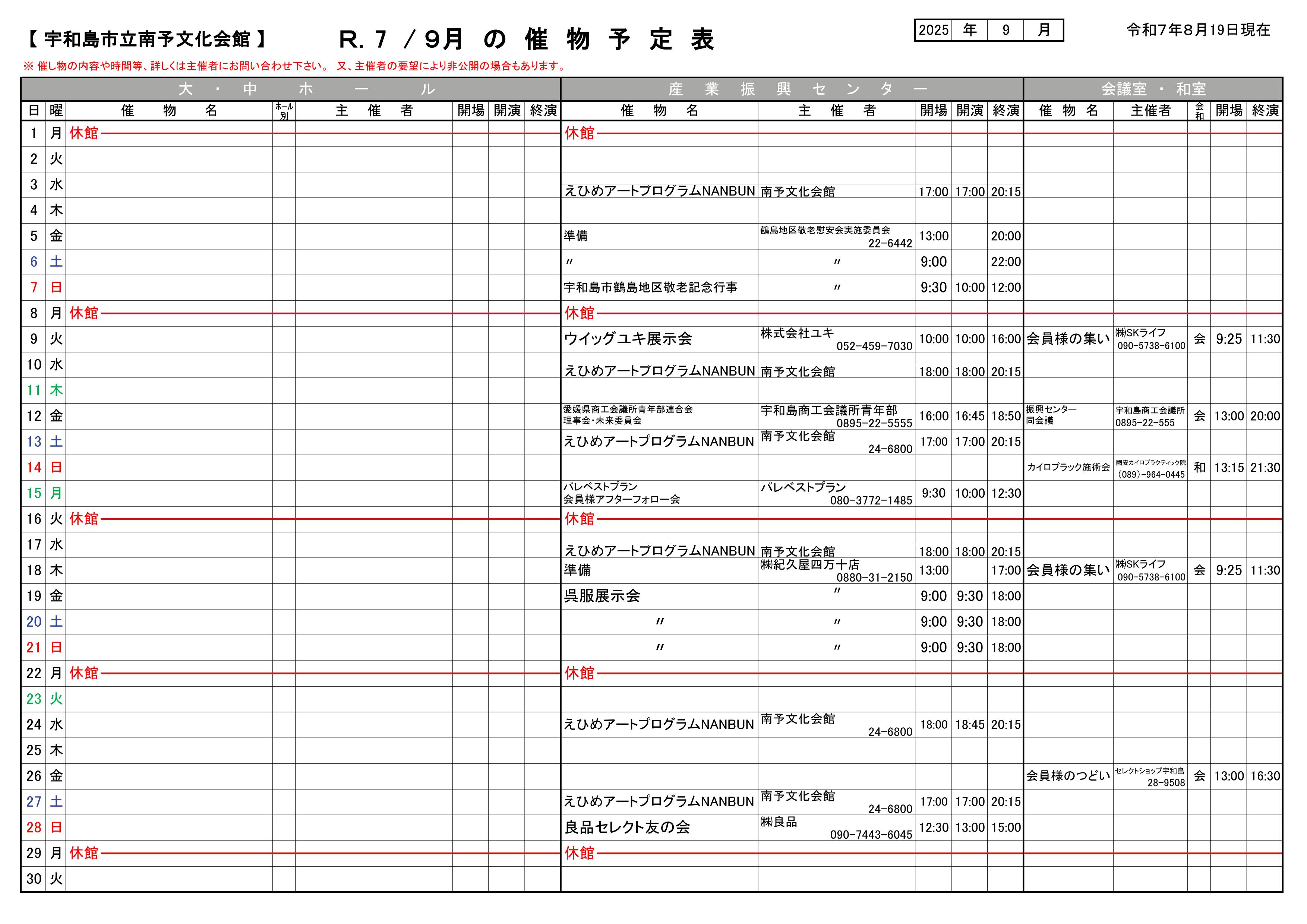 13 8月 2025 令和7年9月の催し物予定表を更新しました by uwa-nanbun-admin | posted in: お知らせ | 〇催し物の内容や時間等、変更・非公開の場合もございます。 催し物予定表R7.9月(R7.8.19時点)
